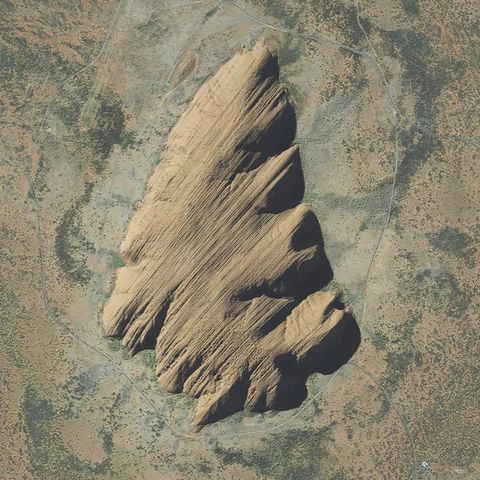 影像解析:澳大利亚艾尔斯岩石又名乌鲁鲁巨石,岩高348米,长3000米,是世界最大的整体岩石。在这座特别突出的艾尔斯山山脚下,公路和车辆都一清二楚。