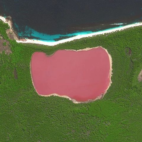 影像解析:希勒湖是一个神秘的、粉红色的湖,位于澳大利亚西澳大利亚州的中岛,紧临海边。