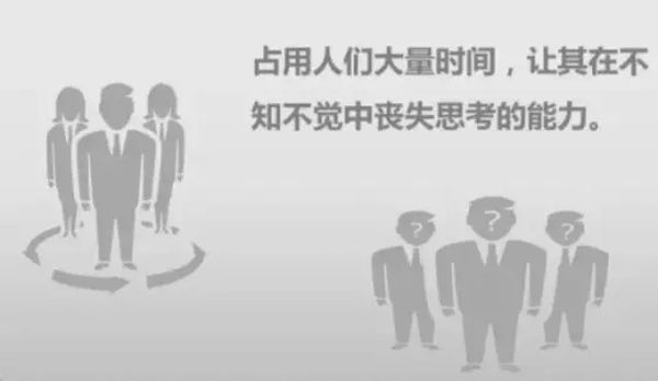 这样一来,通过把令人陶醉的消遣娱乐及充满了感官刺激的产品堆满人们的生活,最终达到目的:占用人们大量时间,让其在不知不觉中丧失思考的能力。