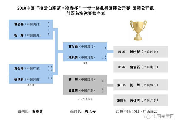 中国棋牌网讯 4月15日,2018中国“凌云白毫茶·凌春杯”一带一路象棋国际公开赛中国姚洪新夺冠,中国澳门曹岩磊亚军。国际邀请组缅甸段培超冠军,马来西亚安华亚军。