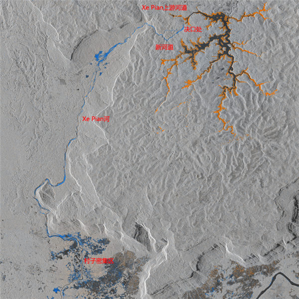 其中蓝色部分是雷达回波显著减少的区域,这里是陆地变成水面。可以看到从Saddle-Dam D溃决冲出的洪水塑造了一条新河道,汇入Xe Pian河。Xe Pian河道以及两侧有很多蓝色区域。上图左下河道两侧有很多村子,它们都遭到没顶之灾,截止25日水位依然未退。