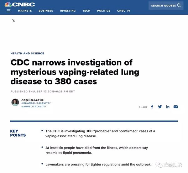 2019年11月8日,“CNBC”报道称,已有超过2000人患上“电子烟肺炎”,39人死亡。