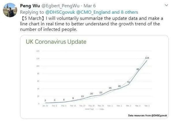我是在3月5日,英国卫生部官方推特发布信息说英国新冠肺炎确诊病例累计达115例时,开始做相关图表的。当时,官方发布的内容只有简单的文字和数字,大家很难了解疫情的变化趋势,评论区也有很多人询问之前什么情况。