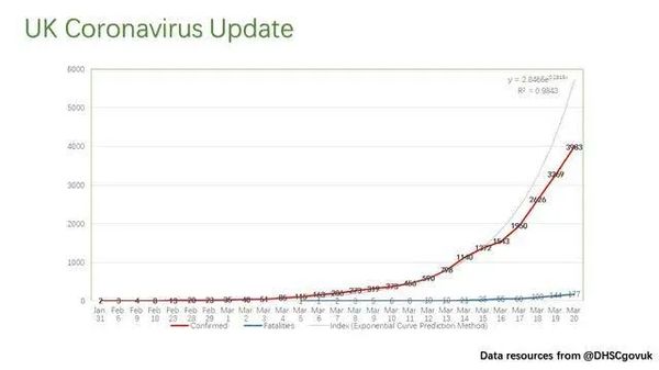 刚开始发布图表时,英国的防疫措施还比较保守和宽松,走在街上,完全感受不到疫情的发生。当时,我根据意大利的情况和一位英国学者的研究预测说,之后每两三天,英国的确诊人数就会翻一番,后来的情况确实如此。
