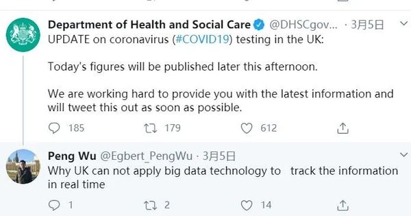 于是,我就想做张图,让人们能一目了然地看到疫情的发展趋势。当天,我从1月31日英国出现最早2例确诊病例时做起,在英国卫生部推特下留言发布了第一张英国确诊新冠病例的趋势图表。