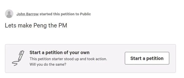 英国网友发起“PengForPM”(吴芃当首相)话题和网络请愿活动,以开玩笑的形式肯定他的付出。