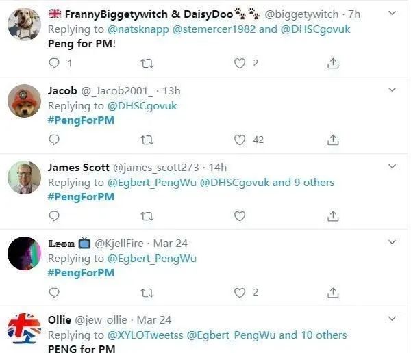 推特上有网友发起了一个话题“PengForPM”,说让我当首相,这是英国人开的玩笑。我觉得,可能是因为网友对英国政府之前比较保守的防疫措施有意见,希望政府采取更有力的措施。
