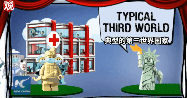 视频中,代表中国的兵马俑乐高小人不断地向世界发布新冠病毒的有效信息,而代表美国的自由女神乐高小人,则不断地予以否认。最终,自由女神乐高小人红起了脸,打起了点滴.....