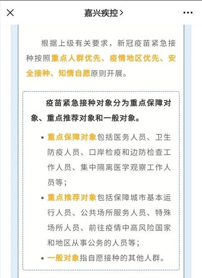 上述《说明》介绍,嘉兴市先期已在重点保障对象中陆续开展新冠疫苗接种,后续将逐步开展一般对象接种。嘉兴市目前用于紧急接种的新冠疫苗由省级部门统一向北京科兴中维生物技术有限公司征订,逐级分发至定点接种单位。该疫苗尚未正式注册上市,经依法批准用于紧急接种。