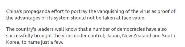 之后,这篇标题里挂着“美国可以学习中国”内容的文章中一个最奇葩的地方就出现了:它突然宣称美国可以去学中国台湾省和新西兰,并称这俩“民主”的地方证明了防疫并不需要“专制”的体制。