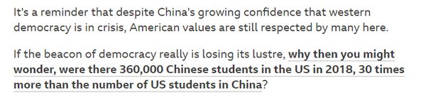 他甚至还搬出一个中国留学生的说法称,美国的空气更香甜,大学鼓励思考,而中国只会教你对错。