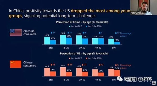 博然思维的调查发现,18岁到29岁年龄组的中国青年对美国的好感度从48%下滑至23%,降幅高达25个百分点,大于总体人群下滑18个百分点的幅度。30岁到39岁的中国壮年对美好感度也下降21个百分点。青壮年对美观感恶化程度明显大于中老年。