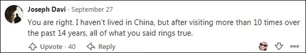 “Pete Truman”选择点赞另一位网友评论作为回应:“注意,我们在谈中国,不是韩国或日本。”