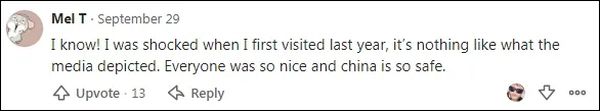 “我懂!我去年第一次去的时候都震惊了,她和媒体描述的完全不一样。那里的每个人都如此友好,中国是如此安全。”