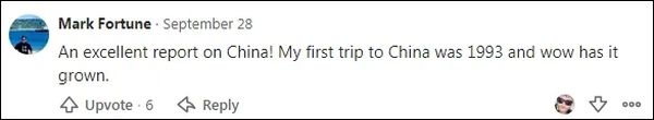 “这是一篇关于中国的优秀‘报道’!我第一次去中国是在1993年,她的发展让人惊叹。”
