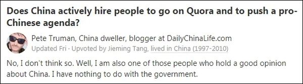 而其中一个提问很有意思:“中国有没有雇人在Quora上推动亲华议程?”