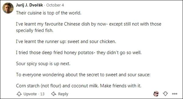 “他们做菜真是世界一流。我现在已经学会了我最喜欢的中国菜——除了特制炸鱼还没学会。第二喜欢的咕噜鸡肉我也学会了。我试过油炸蜂蜜土豆——味道不太好。还有胡辣汤。我要告诉每一个想知道糖醋酱奥秘的人这两样东西:玉米淀粉(不是面粉)和椰奶。快用起来。”