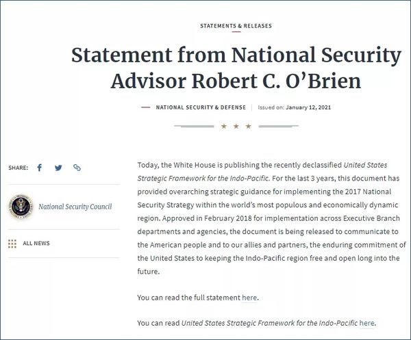 当地时间1月12日,美国白宫国家安全委员会(NSC)公布了《美国印太战略框架》秘密文件。特朗普的国家安全顾问奥布莱恩(Robert C. O'Brien)随文件的公布,撰写了公开声明。