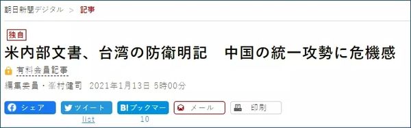 日本《朝日新闻》于北京时间13日晨4时报道了这份文件。并强调了文件中“美方明确表示要防卫台湾,以及支持日本自卫队和台湾军队的近代化。”