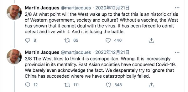 “中国的政府和人民之间有一定程度的和谐、亲近,有协作、也有理解,政府与社会之间也是,而在西方,则完全不是这样。看下各国疫情的情况,中国及其他受儒家文化影响的国家都取得了不同程度的成功。而西方世界,除了新西兰,都应对得很差劲。”