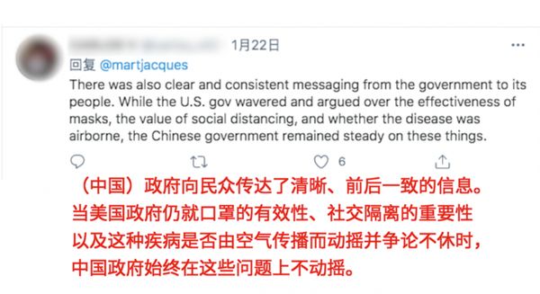 “(中国)政府向民众传达了清晰、前后一致的信息。当美国政府仍就口罩的有效性、社交隔离的重要性以及这种疾病是否由空气传播而动摇并争论不休时,中国政府始终在这些问题上不动摇。”