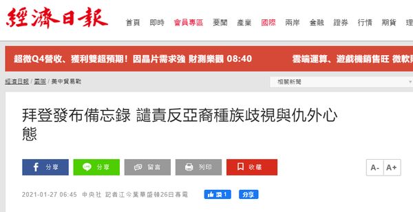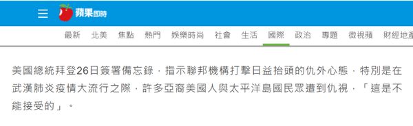 然而,目前台湾地区尚没有任何媒体提及拜登谴责和要求不得再使用歧视性称谓称呼新冠病毒的表态。台湾中央社虽然报道了拜登签发的备忘录,却将备忘录中第二段这个极为显著的针对新冠病毒称谓的内容,给省略掉了。