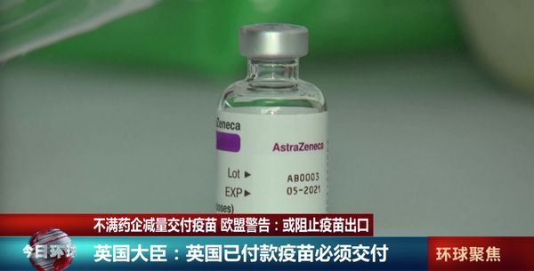 英国内阁办公厅大臣戈夫28日则告诉伦敦广播公司电台,英国已经购买和付款的疫苗必须得到交付。当被问及英国政府是否会阻止阿斯利康把给英国的疫苗转卖给欧盟,戈夫说,关键的事情是英国按计划、按时接收疫苗。