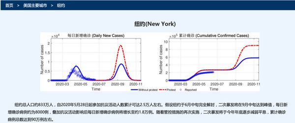 系统模拟预测结果显示,以纽约为例,如没有示威游行活动,预测模型显示第二次暴发将在9月上旬到达高峰,最大每日新增确诊将达8000人左右;而示威游行则增加了二次暴发的强度,届时每日新增确诊人数可超过1.8万人。