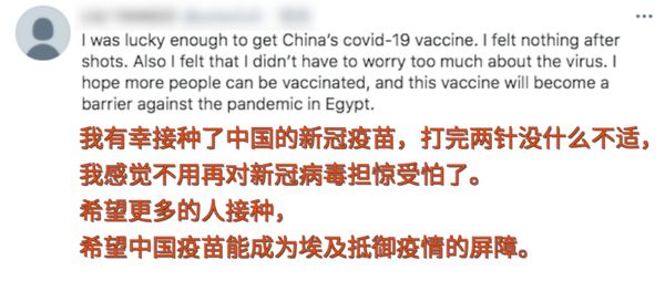“我有幸接种了中国的新冠疫苗,打完两针没什么不适,我感觉不用再对新冠病毒担惊受怕了。希望更多的人接种,希望中国疫苗能成为埃及抵御疫情的屏障。”