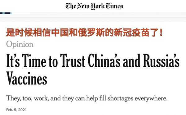 《纽约时报》2月5日发表的评论文章中指出,越来越多的证据表明,中俄疫苗可靠、有效,“是时候信任中国和俄罗斯的新冠疫苗了!”