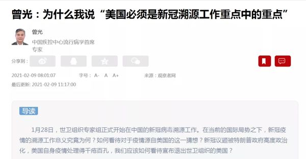 在今晨见诸媒体的最新采访中,曾光再次强调对美进行溯源调查的重要性:美国牵涉到的问题很多,不仅限于新冠病毒溯源。