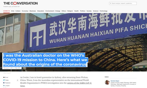 不过,就在今天,澳大利亚“对话”网站却刊登了一篇由Dominic Dwyer亲自撰写的文章,其中重点谈到了他在武汉参加溯源研究时的经历。