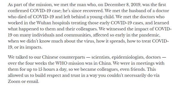 而且,极为“打脸”的是,Dominic Dwyer在文章中不仅没有对中方表达不满,反而还表示他看到了疫情初期的病例和医治这些病例的医生,看到了被疫情最初冲击到的许多个人和社区,查阅了疫情的临床流行病学和分子流行病学方面的大量数据,以及动物和环境方面的数据,并与中方的科学家和医生在合作中“成为了同事乃至朋友”,并建立起了无法通过电子邮件和视频会议而实现的“信任与尊重”。