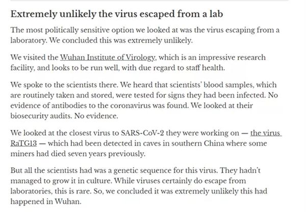 更重要的是,Dominic Dwyer亦明确地表示新冠病毒从武汉病毒实验室“制造或泄露”出的可能性极低,不仅因为武汉病毒实验室的防护措施良好,且没有证据显示研究人员感染过新冠病毒(包括他们的血液中没有发现新冠抗体),而且Dominic Dwyer还透露说,武汉病毒实验室其实有的只是一个与新冠病毒相近的冠状病毒的基因序列,也未能对这一病毒进行培育,所以他们一致认定所谓的病毒是由武汉实验室制造或泄露的情况是极为不可能的。