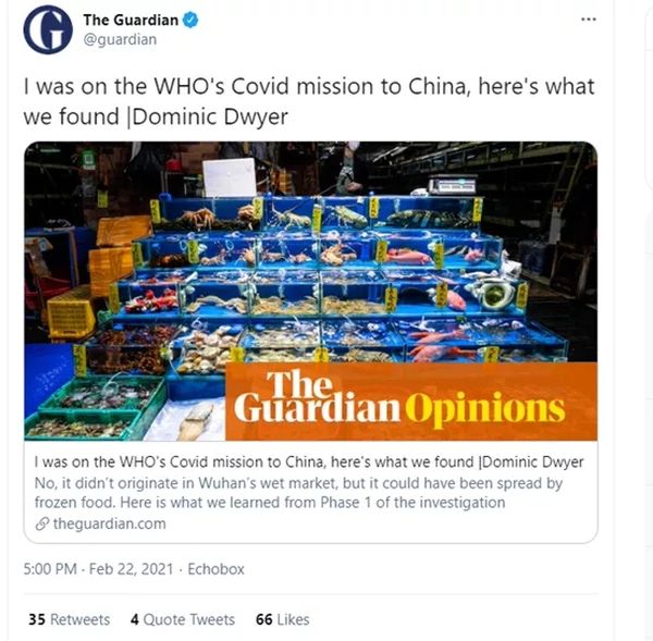 遗憾的是,截至目前,这篇文章只有澳大利亚广播公司的网站以及英国《卫报》进行了转发。其他西方媒体则大多对这篇报道中Dominic Dwyer给出的说法保持着“沉默”,尤其是那些之前歪曲他的观点用来炒作“中国拒绝给数据”的美国媒体。