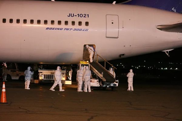 22日晚间的成吉思汗国际机场异常寒冷。装有新冠疫苗的飞机平稳降落之后,数名身穿防护服的工作人员先对机舱内外部环境进行消杀,再将装有疫苗的纸箱通过传送带缓缓运至专车上。
