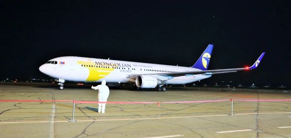 2月22日,负责运送新冠疫苗的包机降落在蒙古国首都乌兰巴托成吉思汗国际机场。新华社记者阿斯钢摄