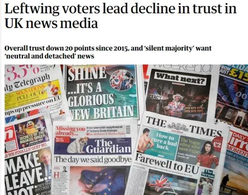 (图为英国《卫报》在去年的一篇报道中指出英国人对媒体的信任度自2015年下降了20个百分点,而且许多人希望媒体更中立)