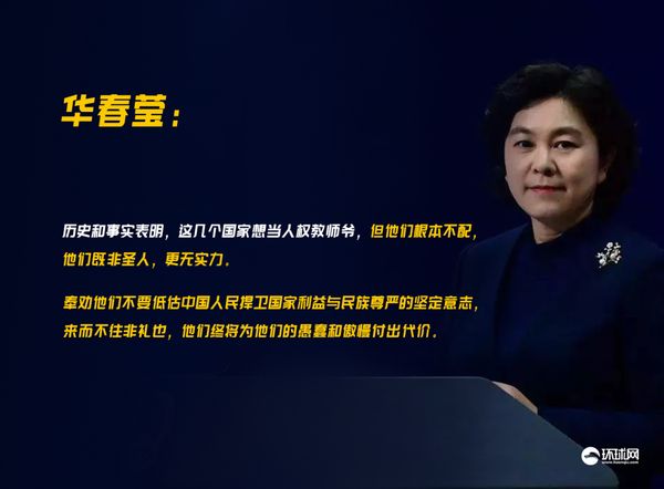“历史和事实表明,这几个国家想当人权教师爷,但他们根本不配,他们既非圣人,更无实力。”华春莹说,希望他们明白:今天的中国不是伊拉克,不是利比亚,也不是叙利亚,更不是120年前的中国。外国列强架起几门大炮就能打开中国大门的时代,已经一去不复返了;几个所谓的学者和媒体同官方勾结就能肆无忌惮抹黑攻击中国,而不受任何惩罚的日子,也一去不复返了。奉劝他们不要低估中国人民捍卫国家利益与民族尊严的坚定意志,来而不往非礼也,他们终将为他们的愚蠢和傲慢付出代价。