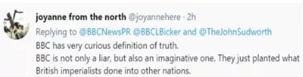 福迪继续指出,“BBC现在甚至都没有试图掩盖这一点”,并提到“BBC天文级别的傲慢、对相反观点的蔑视和平庸的自以为是,确实让它成为了这个星球上最令人难以忍受的新闻机构”。“BBC在中国自断退路这一点上只能怪它自己。尽管它躲在‘新闻自由’的口头禅后,假装自己是真理的仲裁者,但BBC在制造共识以反对中国、并发动新冷战方面,扮演了啦啦队长的角色。”