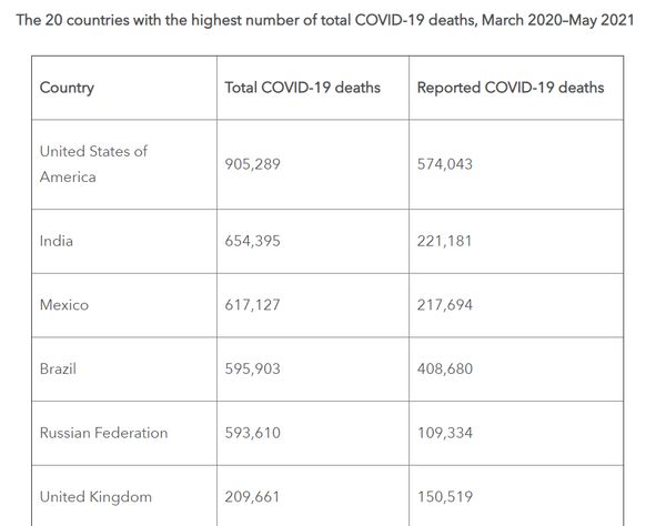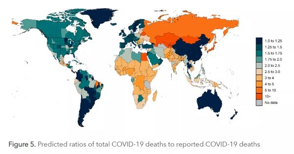 总之,IHME是通过这番复杂的计算,才算出了诸如美国的新冠肺炎死亡的“总人数”可能是90万,印度的则是65万这样的数据,并由此得出了新冠肺炎的死亡人数在许多国家都被低估了,以及被低估的程度大多在1倍以上这样的结果。