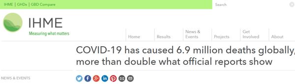 IHME分析认为,全球恐怕已有690万人被新冠病毒夺去生命,其中美国的因新冠肺炎而死亡的总人数最多,约为90万人,比该国目前上报的57万人的数字多了近一倍。其次是印度,为65万人,比印度目前上报的22万人的数字多出了约2倍。