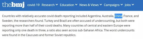 另外,中国在此图中被标注在了深绿色的区间,这意味着中国上报的数据是最接近准确的新冠肺炎死亡总人数的。国际知名医学期刊《英国医学杂志》在报道IHME的这篇报告时,亦提到了中国与澳大利亚、瑞典、法国和阿根廷一样,是上报新冠疫情死亡病例数相对准确的国家之一。