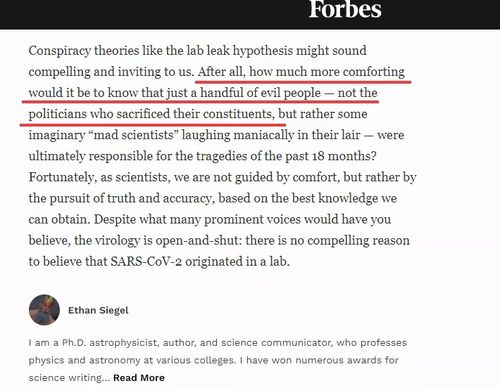另外,一些美国的科学媒体人也在努力驳斥着病毒来自武汉实验室的这种阴谋论。比如美国科普作者Ethan Siegel就在一篇刊登在美国福布斯新闻网上的文章里表示,详细阐述了为何新冠病毒不可能是武汉实验室制造或泄露出来的,为何更可能来自自然界,并驳斥了许多虚假的阴谋论。
