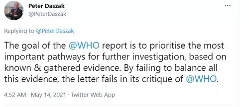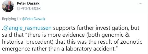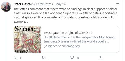 而且,达萨克近日还专门发帖抨击了巴里克签署的那封要求“调查”武汉病毒所的公开信,称他和那些来武汉进行溯源研究的学者已经发布了大量且充分的资料证明了病毒最有可能来自自然界,来自实验室的可能性则几乎不存在,他无法理解为何这封信会选择性忽视这些丰富的证据和数据。