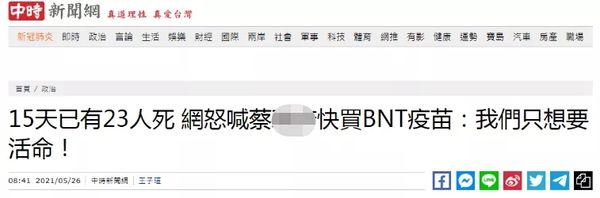 台湾中时新闻网消息,自5月11日起,台湾新冠肺炎本土确诊人数已累计达3656人,截至25日已有23人死亡。南投县县长林明溱25日表示,民进党当局若授权开放地方政府采购新冠疫苗,南投县将马上向上海复星医药代理采购德国BNT辉瑞疫苗30万剂。此消息在网上引发热烈讨论,大批岛内网友疾呼民进党当局赶快买BNT疫苗,此时此刻生命最重要,老百姓也只希望能够活着而已。还有网友喊出 “我是同路人,祖国救我”。