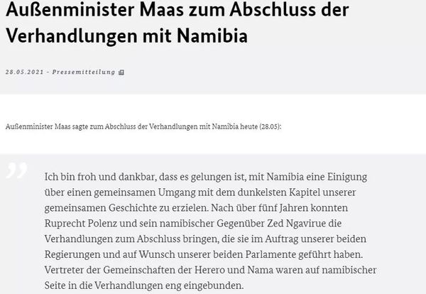 德国政府于2015年开始与纳米比亚政府就所谓的“面向未来的德国殖民统治重新评估”进行谈判。在持续了五年多的谈判中,赫雷罗族和纳马族的代表密切参与了谈判。