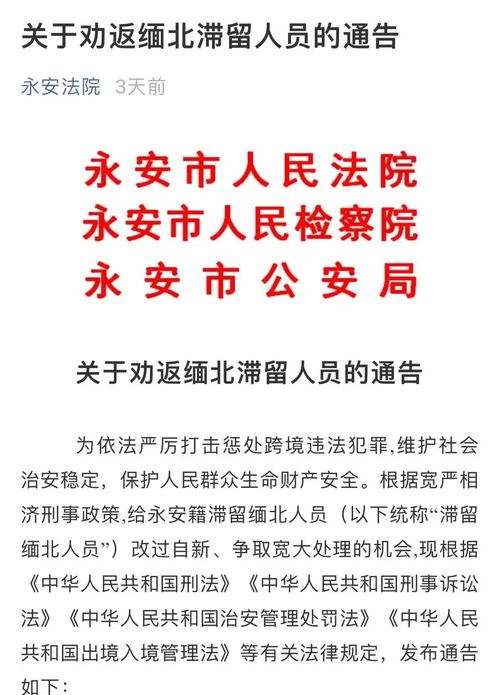 5月27日,为依法严厉打击惩处跨境违法犯罪,维护社会治安稳定,保护人民群众生命财产安全。根据宽严相济刑事政策,给永安籍滞留缅北人员(以下统称“滞留缅北人员”)改过自新、争取宽大处理的机会,现根据《中华人民共和国刑法》《中华人民共和国刑事诉讼法》《中华人民共和国治安管理处罚法》《中华人民共和国出境入境管理法》等有关法律规定,发布通告如下: