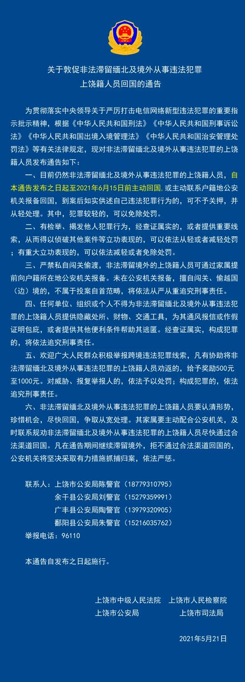 凡是滞留缅甸北部的南溪籍人员,至少提前7天通过电话向警方报备后,务必于2021年5月31日前,向当地申报入境,通过正规渠道回国。主动回国并如实供述违法犯罪行为的,可以依法从轻、减轻处罚;情节轻微的,可以免予处罚。