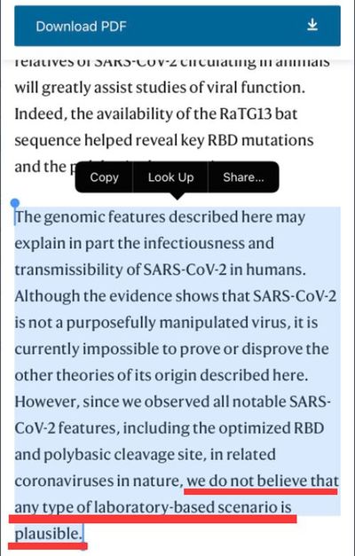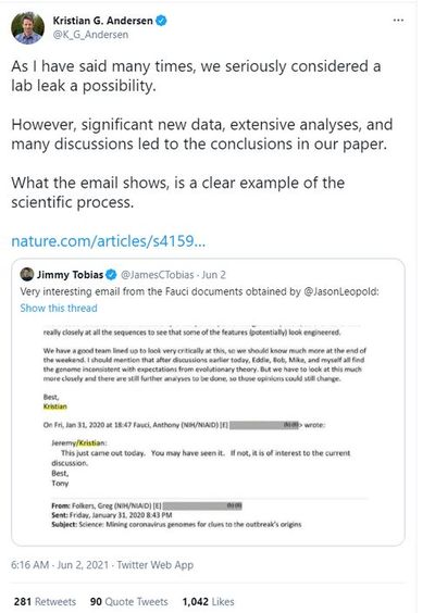 让人敬佩的是,安德森再次站了出来,在他的个人社交账号上发帖说道:“就像之前多次讲过的那样,我们曾经认真地考虑过病毒来自实验室的可能性。但是,重要的新数据,大量的分析以及许多的探讨让我们最后得出了我们论文中(新冠病毒来自自然界)的结论。”